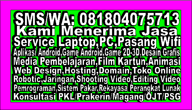 Kami juga menerima jasa pembuatan game, game android,game 2d 3d, jasa pembuatan animasi 2d 3d, jasa pembuatan web, jasa hosting domain, jasa pembuatan aplikasi,jasa pembuatan media pembelajaran,jasa service laptop pc printer, jasa pemasangan jaringan,dll , terima kasih tetap semangat.
