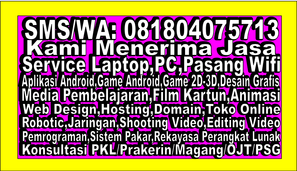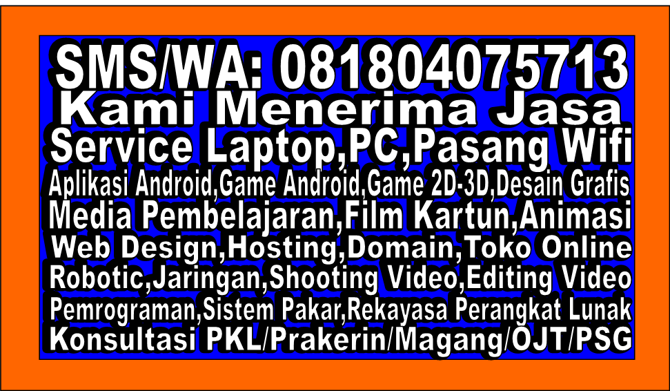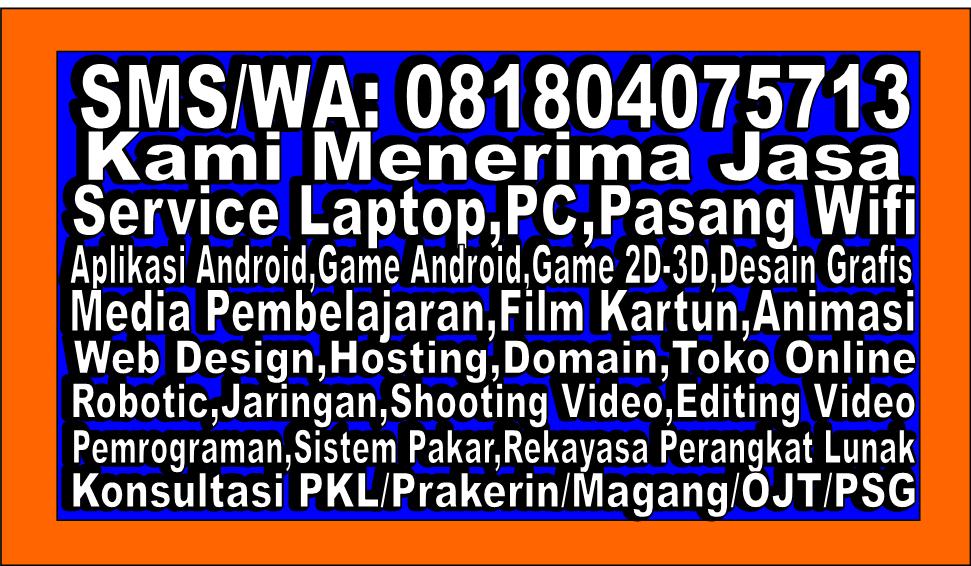 Kami juga menerima jasa pembuatan game, game android,game 2d 3d, jasa pembuatan animasi 2d 3d, jasa pembuatan web, jasa hosting domain, jasa pembuatan aplikasi,jasa pembuatan media pembelajaran,jasa service laptop pc printer, jasa pemasangan jaringan,dll , terima kasih tetap semangat.